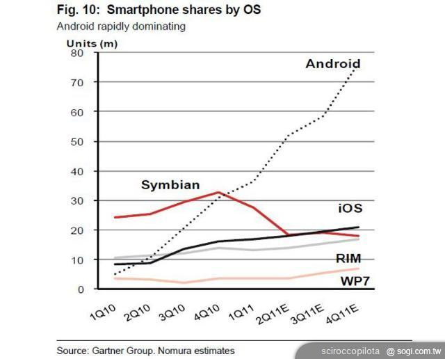 ▲2011 年上半年智慧型手機出貨量繼續成長,而 Android 陣營已成為市場上的絕對領先者。