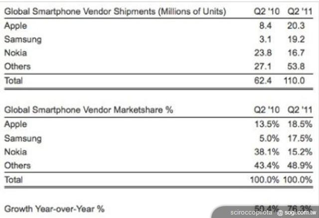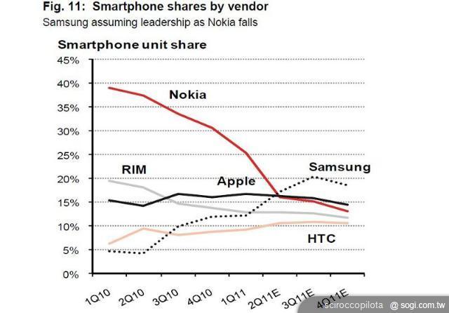 幾家歡樂幾家愁,前述手機品牌成功透過推出智慧型手機而提升了各自的市場佔有率,但也有幾家傳統手機品牌的市佔率面臨危機。2011 年上半年 NOKIA 市佔率滑落的速度超出預期,雖然芬蘭手機巨頭仍以 2,420 萬台智慧型手機的出貨量保住了 2011 年第一季的龍頭、但出貨年成長率僅為 13% 以明顯落後對手。第二季 NOKIA 更遭遇到前所未有的挑戰:Apple、SAMSUNG 與 NOKIA 三家智慧型手機品牌展開了智慧型手機市場霸主的爭奪戰,雖然市場研究機構Gartner 提供的數據顯示 NOKIA 最後仍以些微之差領先(出貨量為 2,390 萬台),但從市佔率下跌的速度來預估、NOKIA 將智慧型手機市場霸主的頭銜拱手讓出只是時間早晚的問題。由於智慧型手機出貨成長速度較慢,第二季 NOKIA 手機總出貨量下滑了 20%(至 8,850萬支)、連帶使得當季轉盈為虧(淨虧損金額達到 3.68 億歐元)。產品週期進入尾聲的 Symbian 系統已經越來越難受到消費者的青睞,執行長 Stephen Elop 因此大膽決定在新款手機上採用微軟的 Windows Phone 系統,在採用 WP7 系統的產品大量鋪貨之前、NOKIA 仍處於轉換陣痛期。