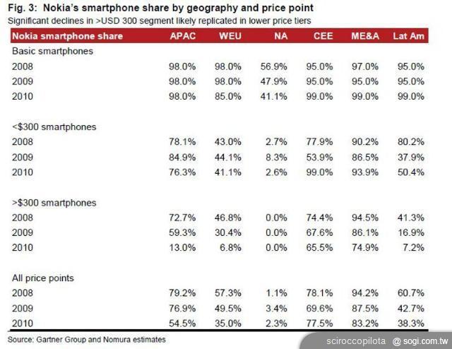 ▲由於 Symbian^3 與其他競爭對手相比,較不具競爭優勢,近三年來 NOKIA 在高階智慧型手機上衰退明顯。