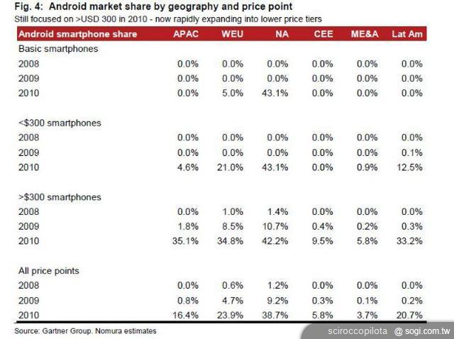 若以地區來分析,隨著中國經濟實力的崛起,包括中國市場在內的亞太市場已成為智慧型手機廠商的兵家必爭之地,過去針對不同地區消費行為分析的研究已經顯示相比於歐美消費者,亞洲新興國家用戶更樂於嘗試新科技、新功能和新產品,因此智慧型手機在包括日本的亞洲國家普遍受到消費者的歡迎。今年上半年由於中國市場對於 iPhone 4 的需求巨大讓 Apple 在亞洲地區獲得了巨大收益。反觀西歐市場與第一季相比、第二季的手機出貨速度有所減緩,電信業者供應商已無法單靠智慧型手機的銷售量成長來彌補功能型手機銷量的衰退。另一個智慧型手機的大本營:北美市場上,由於價位較低的入門級產品大量問世加上多管道的市場行銷策略,加上 SAMSUNG、MOTO、HTC 及 LG 等品牌的大力支持,Android 陣營擴大了自己在美國市場的領先優勢、也在加拿大市場坐上了智慧型手機作業系統的頭把交椅。